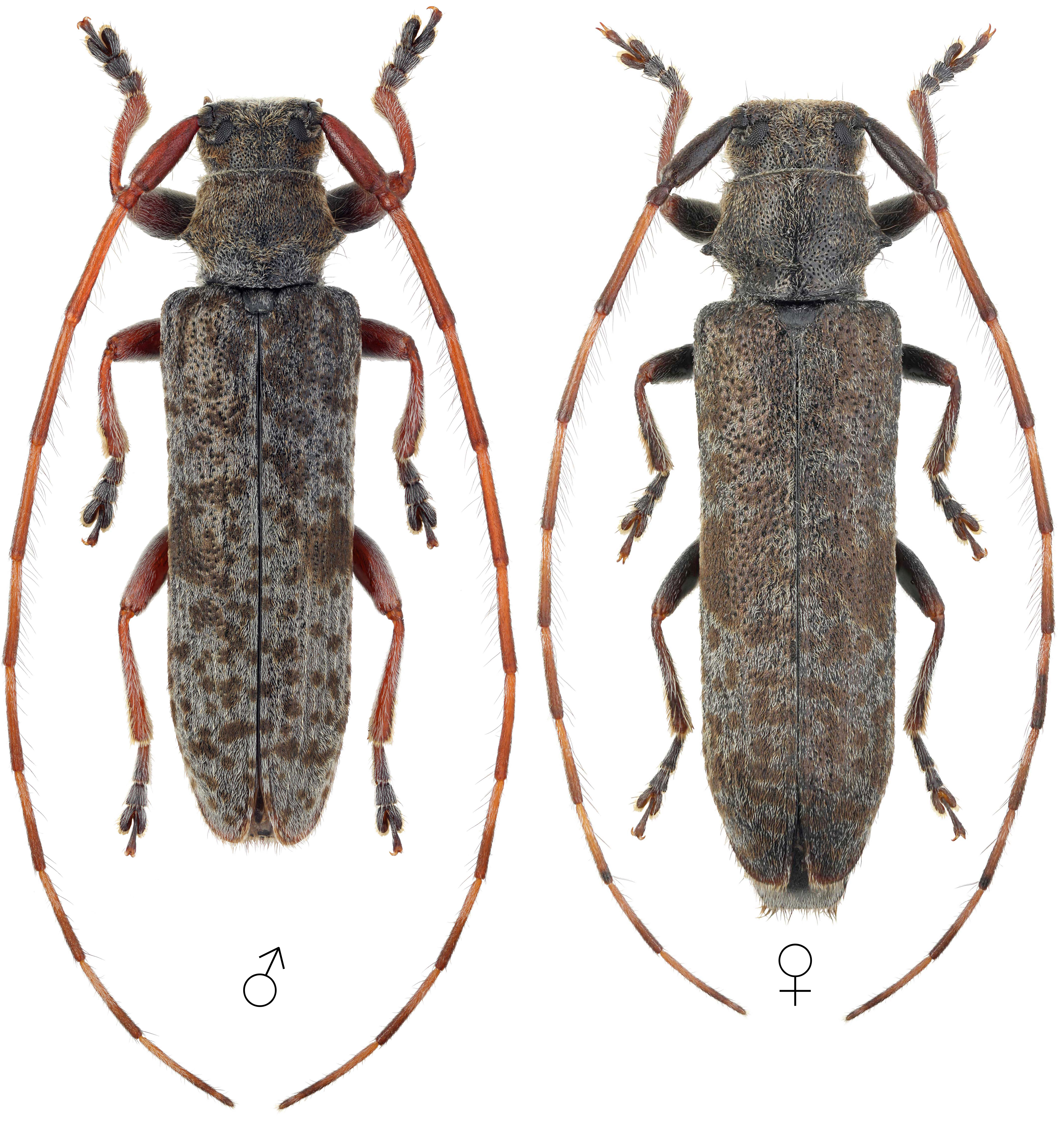 The depicted beetles were collected: ♂ - close to the mouth of stream Odinokyi (Одинокий) (N43°54′42″ E145°30′33″; 1.5 km SWW Alekhino) on August 5, 2011; ♀ - in Tretyakovo (Третьяково) cottage settlement environs (N43°59′09″ E145°39′15″; Valentina creek valley) on August 10-14, 2011. Both localities are located in Kurils Nature Reserve (Kunashir/Кунаши́р island, Kuril Islands, Yuzhno-Kurilsky district, Sakhalin region, Russia).Collected by Kirill V. Makarov and A. Zaitsev