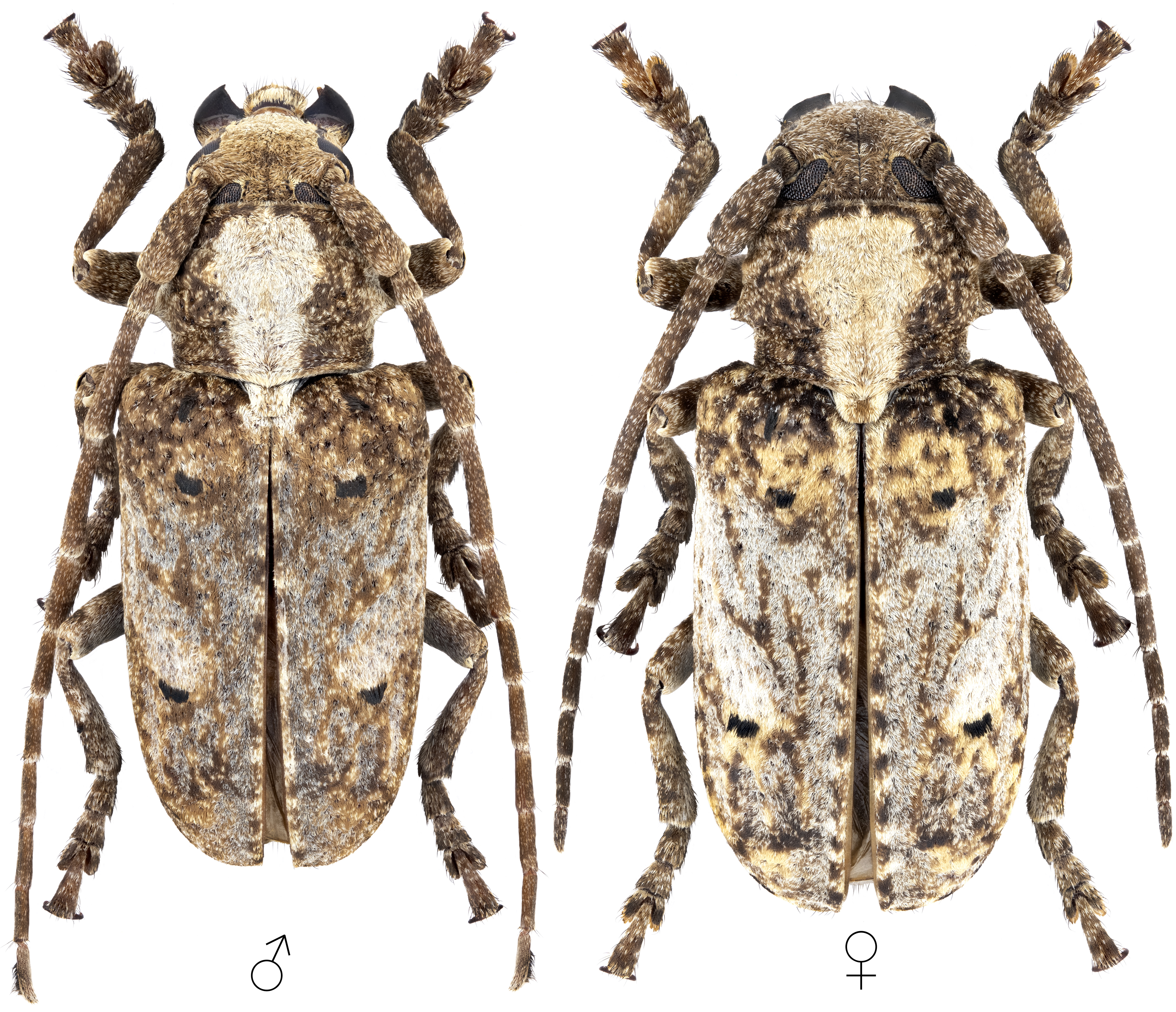 Depicted beetles were: ♂ – reared from larva found in dead Vachellia branch collected in Kasbah near Agadir (135 m a.s.l., Souss-Massa region, Morocco) on May 14, 2007; ♀ – reared from larva found in dead Vachellia gummifera branch collected in Tahanoute/Tehnut village environs (N30°30′10″ W09°36′14″; 200 m a.s.l., 9 km N of Agadir, Souss-Massa region, Morocco) in June 2023.Collected by Petr Kabátek and Petr Papoušek