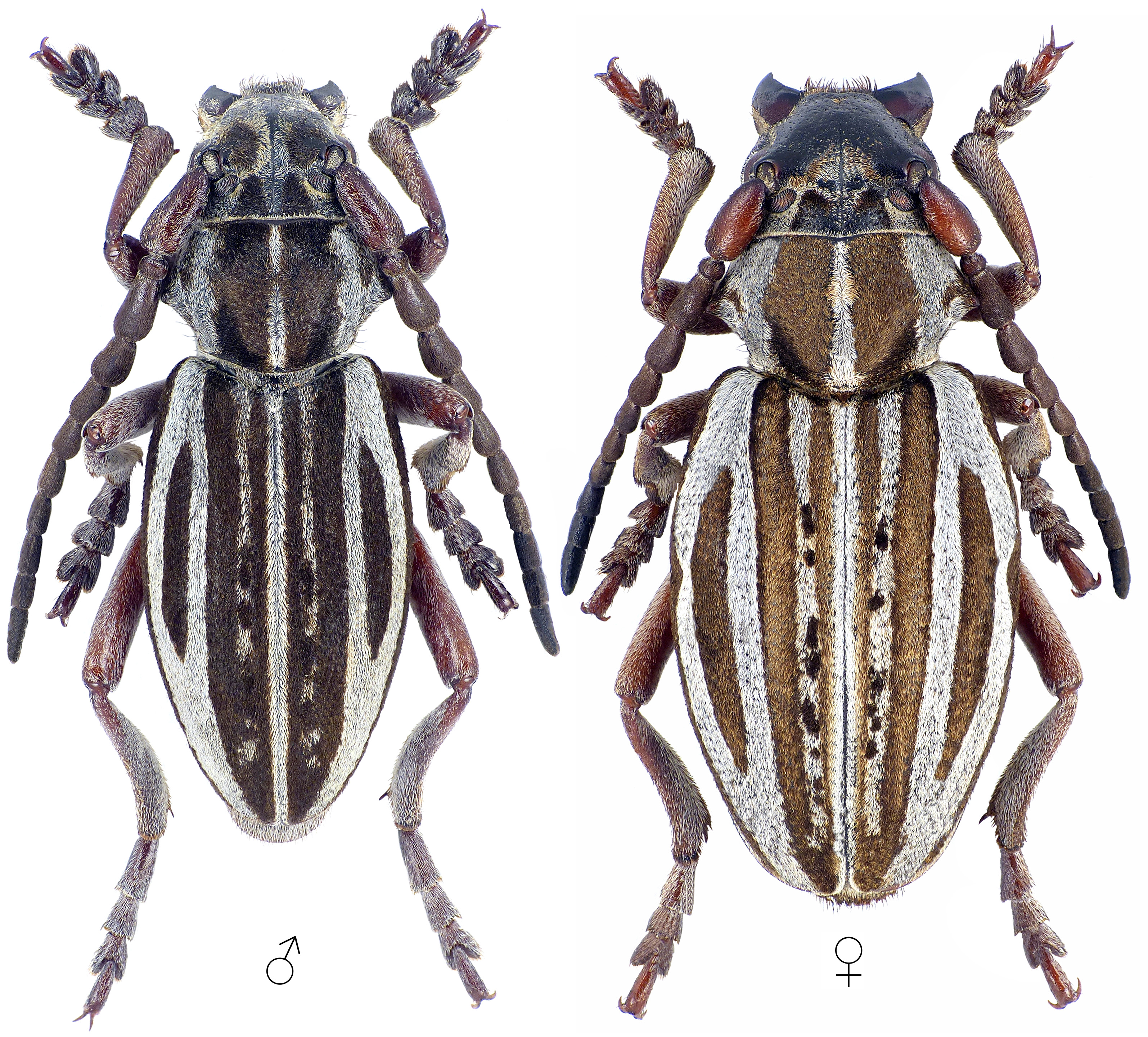 Body length: ♂♂ 8.3 - 14.2 mm / ♀♀ 9.8 - 16.1 mm Life cycle: 1 year Adults in: May - June Host plant: roots and basal stem parts of Poaceae Distribution: an endemic species to Peloponnese (Greece)